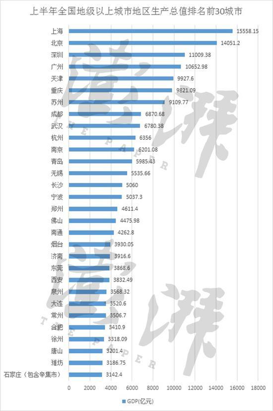 今年上半年,全国地级以上城市地区生产总值排名前30的城市中,上海和北京继续保持1万亿元以上,分别以15558.15亿和14051.2亿的成绩排名第一和第二。