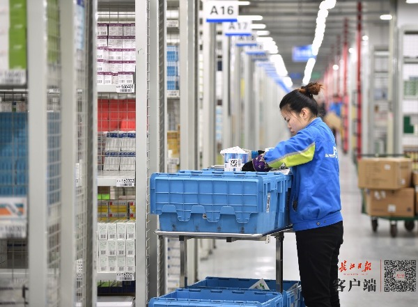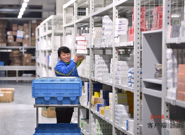 在九州通医药集团物流有限公司,工作人员正在拆零区紧张有序忙碌着。记者郭良朔 摄