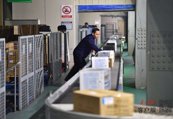 在九州通医药集团物流有限公司,工作人员正把装箱的药品送上传送带。 记者郭良朔 摄