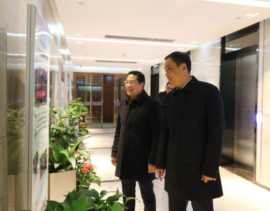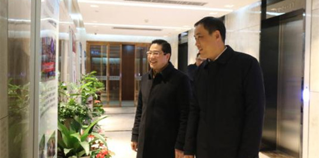 湖北金融租赁公司党委书记、董事长谌赞雄(左)与总裁汤建(右)观看公司发展成果展板