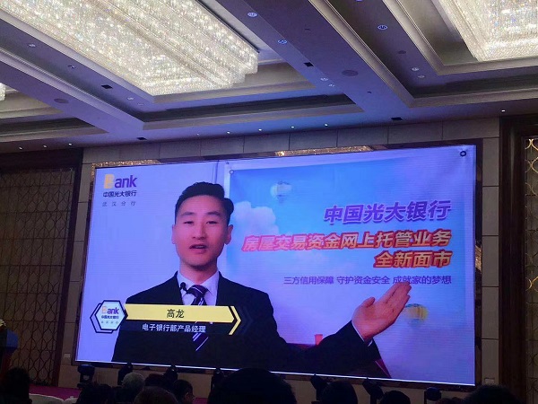 1月7日下午,中国光大银行武汉分行和房融科技信息(武汉)有限公司联合举办“房屋交易资金网上托管业务发布会”。光大银行武汉分行零售业务部总经理赵亮、光大银行新华支行行长吴茵以及房融科技信息(武汉)有限公司的董事长谢娟以及相关领导共同参加了发布会;光大银行新华支行行长助理葛瑞对房屋交易资金网上托管业务的流程以及优势进行了介绍。