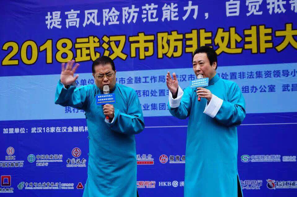 户外活动当天,武汉说唱团“文艺轻骑兵”作为活动的重磅嘉宾,表演了为防范非法集资量身定制的文艺节目。快板《武汉明天更美好》、相声《我不是骗子》、小品《都是集资惹的祸》、湖北大鼓《我要发财》、 相声《弄巧成拙》等节目,在欢声笑语中给市民上了一堂生动的“防非”课,将活动带入高潮。