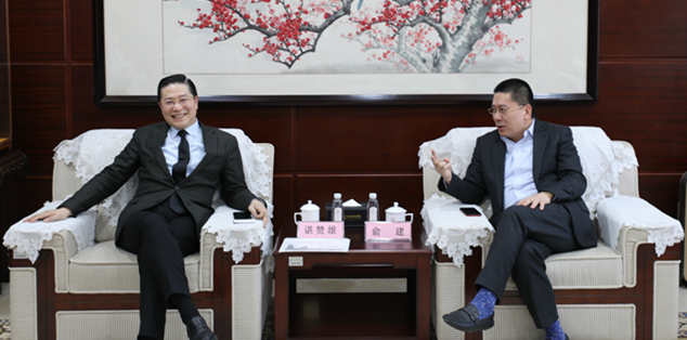 武汉金融控股集团党委书记、董事长兼湖北金融租赁公司党委书记、董事长谌赞雄(左)会见华夏幸福执行总裁俞建(右)一行