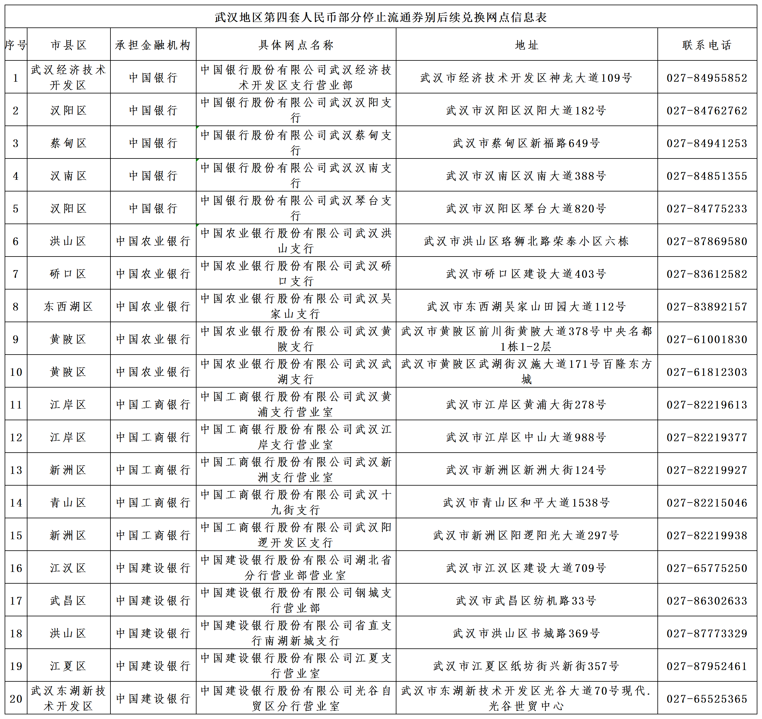 武汉地区第四套人民币部分停止流通券别后续兑换网点公告