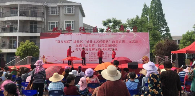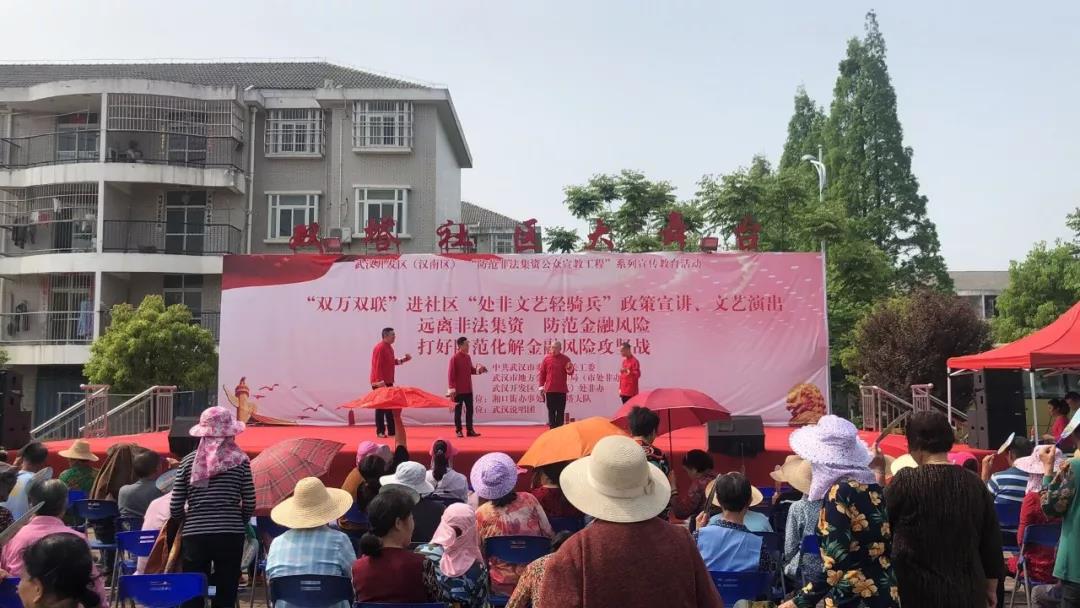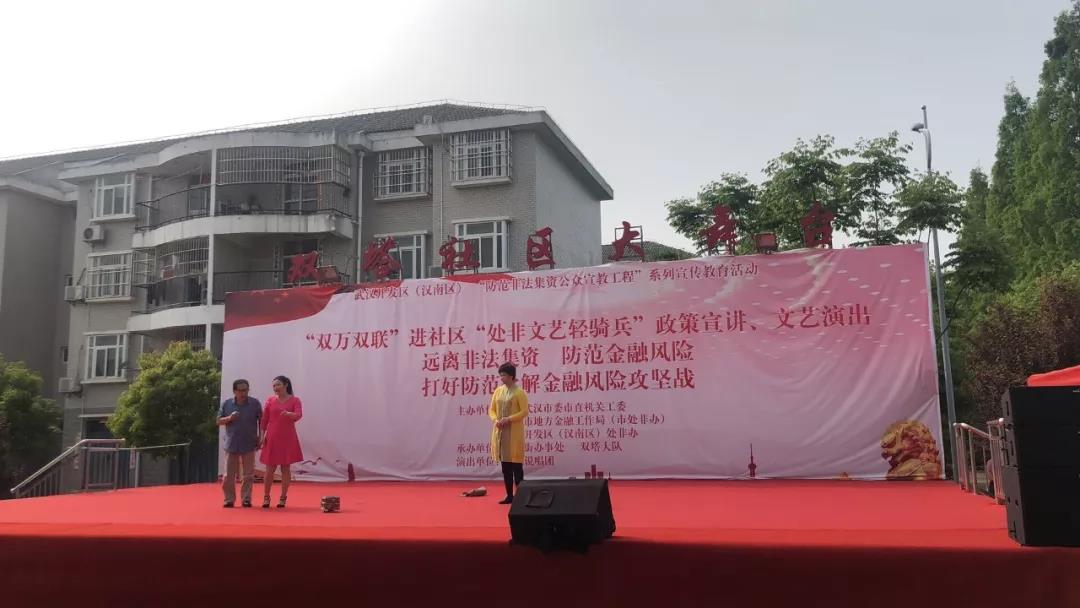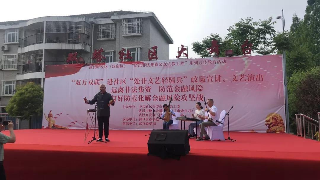 4月25日,由武汉市委市直机关工委、武汉市处非办、武汉开发区(汉南区)主办的“处非轻骑兵”文艺演出,以“远离非法集资 防范金融风险”为主题,邀请武汉说唱团走进湘口街双塔大队,以广大居民群众喜闻乐见,寓教于乐的形式,为远城区200多名观演群众奉献了一场精彩绝伦的文艺演出。
