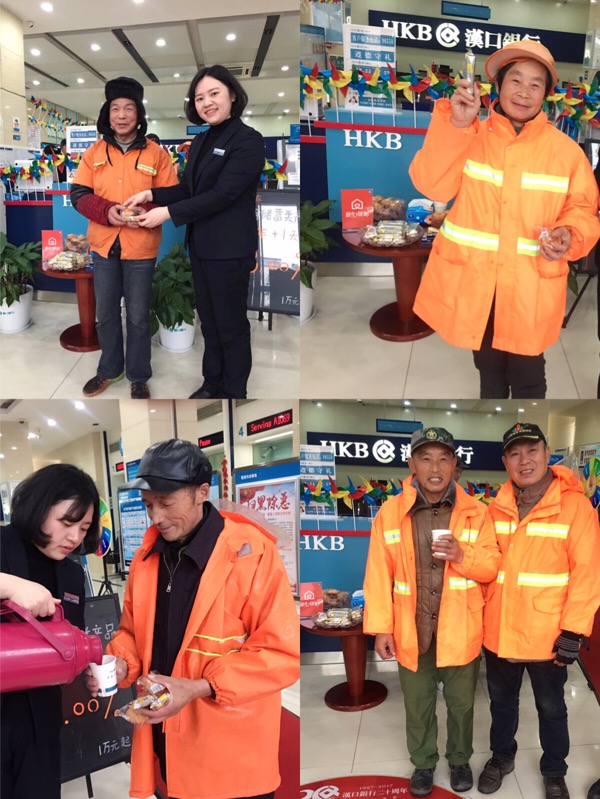 汉口银行2018年年底启动爱心驿站项目,面向武汉市全部3.6万位环卫工人,提供饮水、手机充电、报刊阅读等爱心服务,在每个营业日中午集中提供爱心食品。今年年初,大雪突袭武汉,爱心驿站的工作人员们为周边环卫工人递上热茶姜汤,给寒风中作业的工人送去冬日温暖。春夏雨水连绵,爱心驿站敞开大门迎接环卫工人避雨小憩,进食休息。爱心驿站成为了环卫工人们在辛苦劳作间隙歇歇脚、擦擦汗、喝口水、充充饥、喘口气的“另一个家”,在环卫工人中收获了广泛赞誉和好评。汉口银行希望借此活动,在全社会营造支持环卫工作,尊重环卫工作者劳动,自觉维护城市环境的良好氛围,形成人人理解、支持和关心环卫工作的社会新风尚。