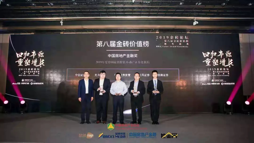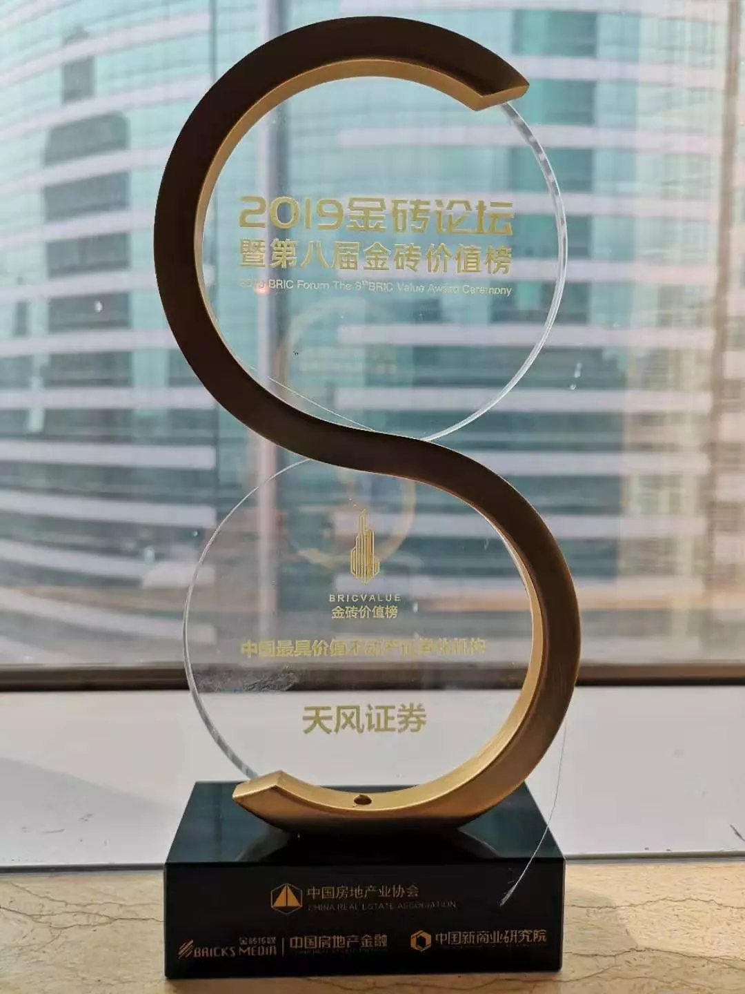 2019年8月30—31日,由中国房地产业协会指导,金砖传媒、《中国房地产金融》杂志主办的“2019金砖论坛暨第八届金砖价值榜颁奖盛典”于上海隆重举行。天风证券获评“中国最具价值不动产证券化机构”,这是天风证券连续第二年荣膺该奖项。