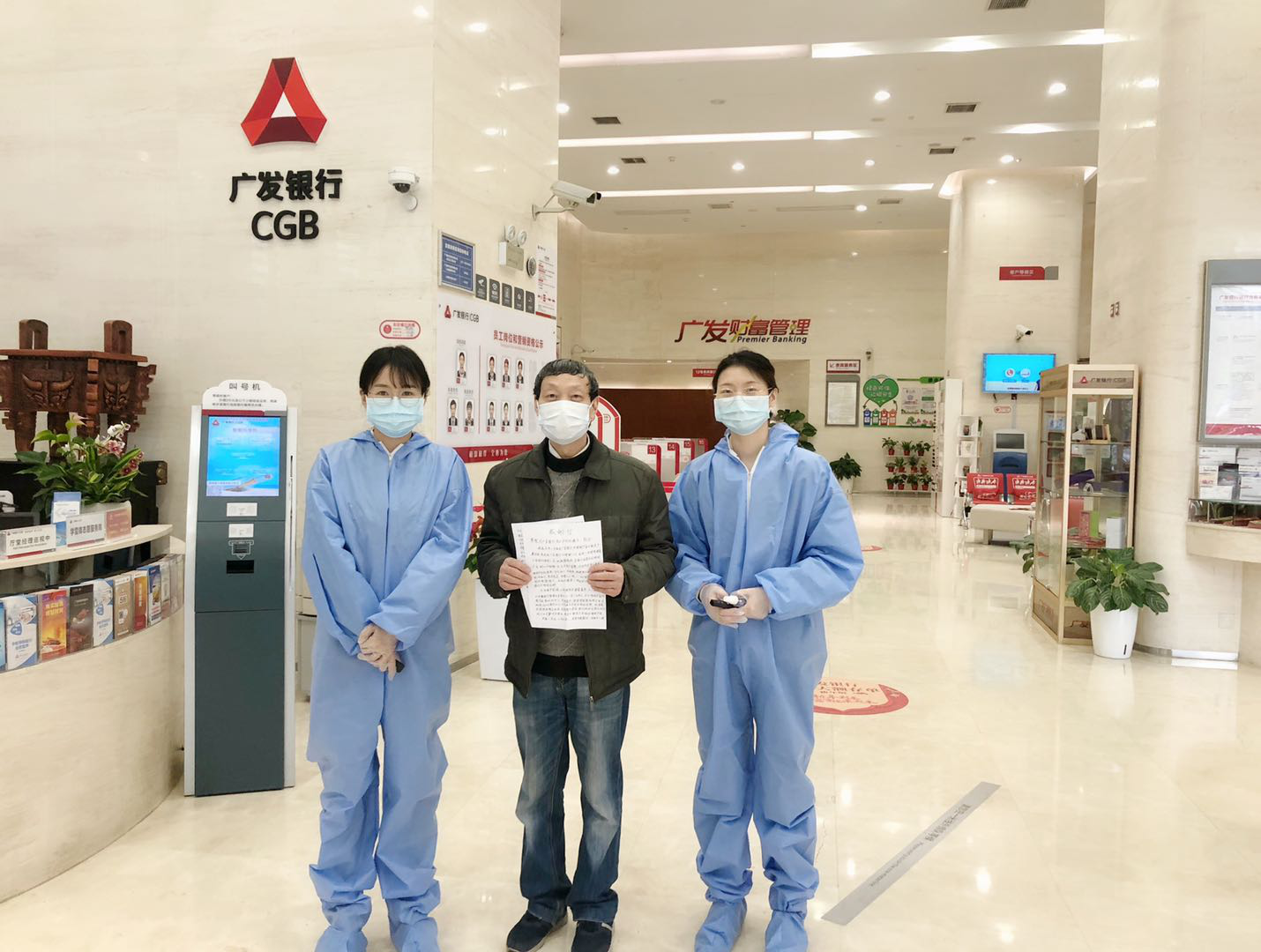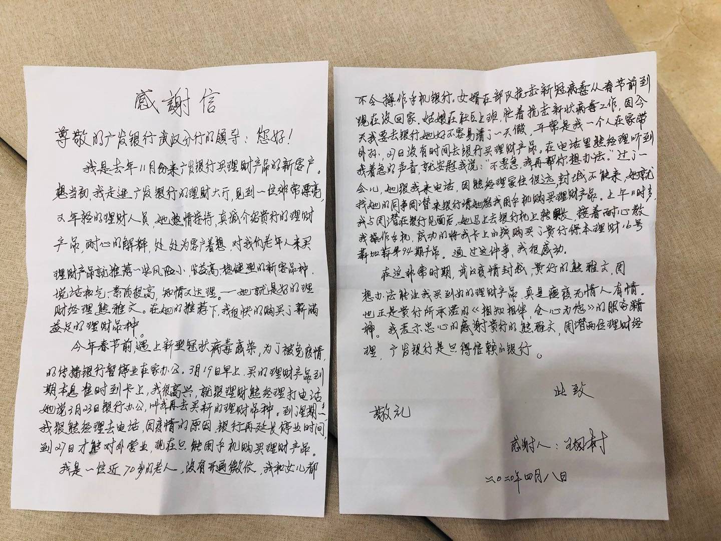 原来,新冠肺炎疫情期间,这位老人带与外孙一直居家隔离。3月19日,有一笔广发银行的理财产品到期,但因自己不会在手机银行在线继续购买理财而非常着急。理财经理熊雅文得知情况后,一边安慰老人不要着急,一边向上级汇报,申请提前帮助老人办理该项业务。3月27日,在网点未恢复正常营业的情况下,厅堂经理周潜专程来到分行营业部处理该业务,全程指导老人办理了产品的续接业务,为此该客户非常感动,特意冒雨送来感谢信。