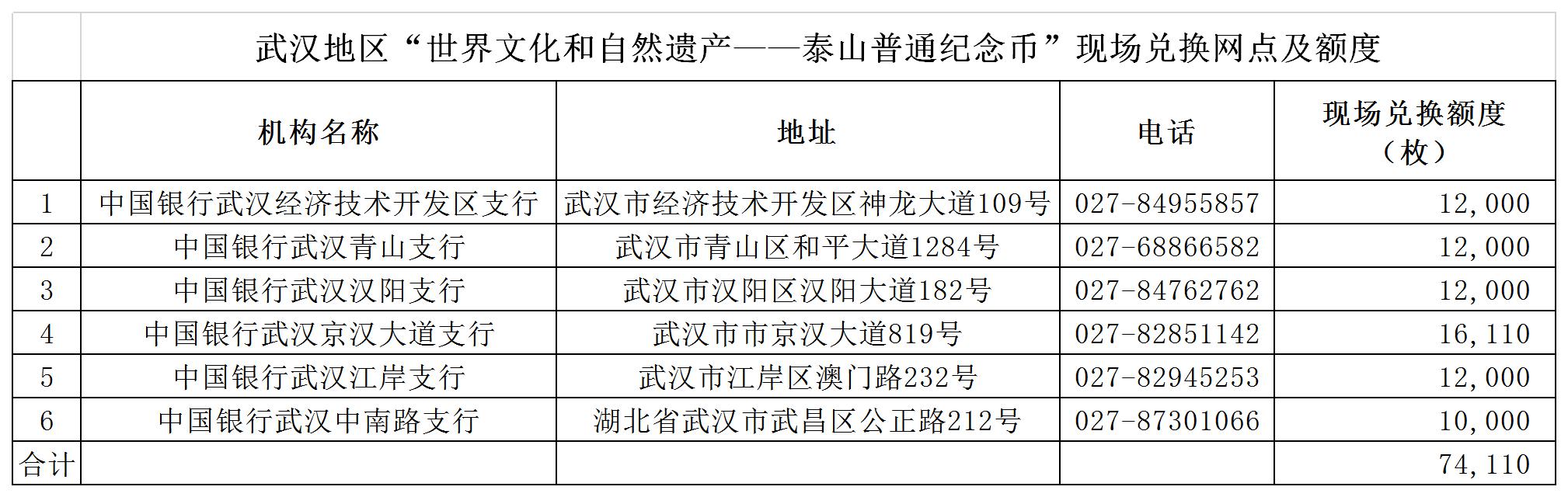 武汉地区“世界文化和自然遗产——泰山普通纪念币”预约未兑换数量为52,110枚,其他地区横向调剂22,000枚,共计74,110枚将全部转为现场发行。