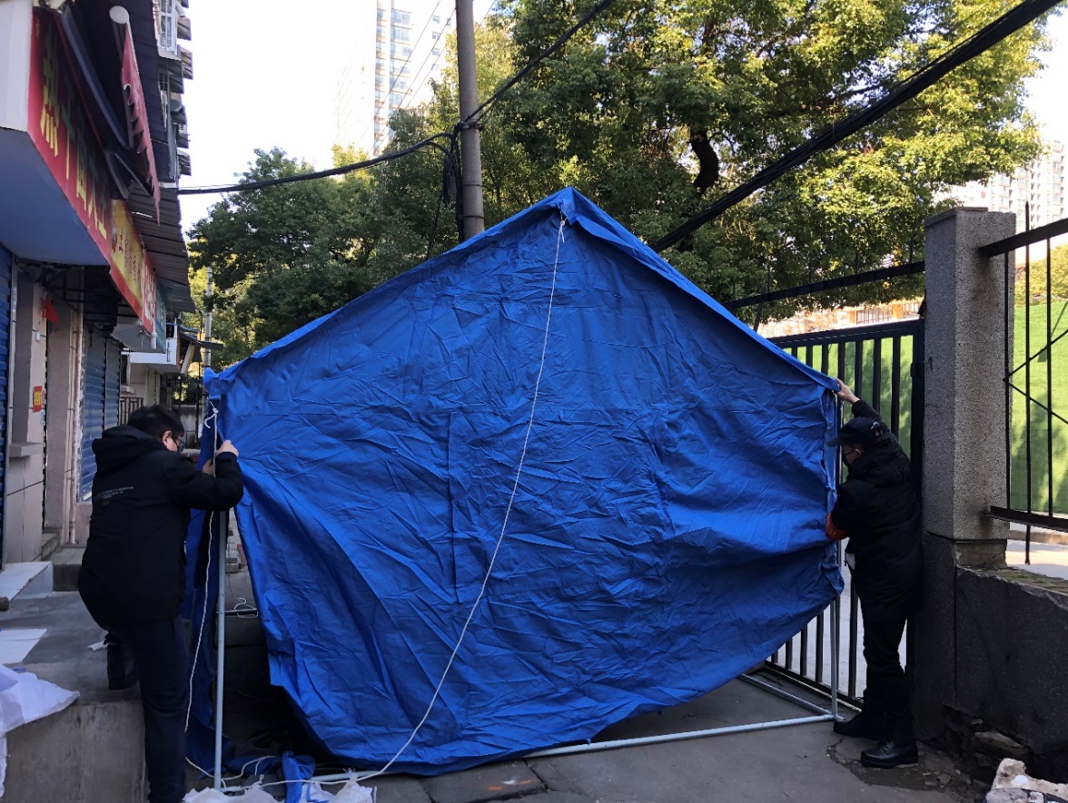 第四小组杨三雄、邵律博同志在东亭社区第九网格架设24小时值班雨棚