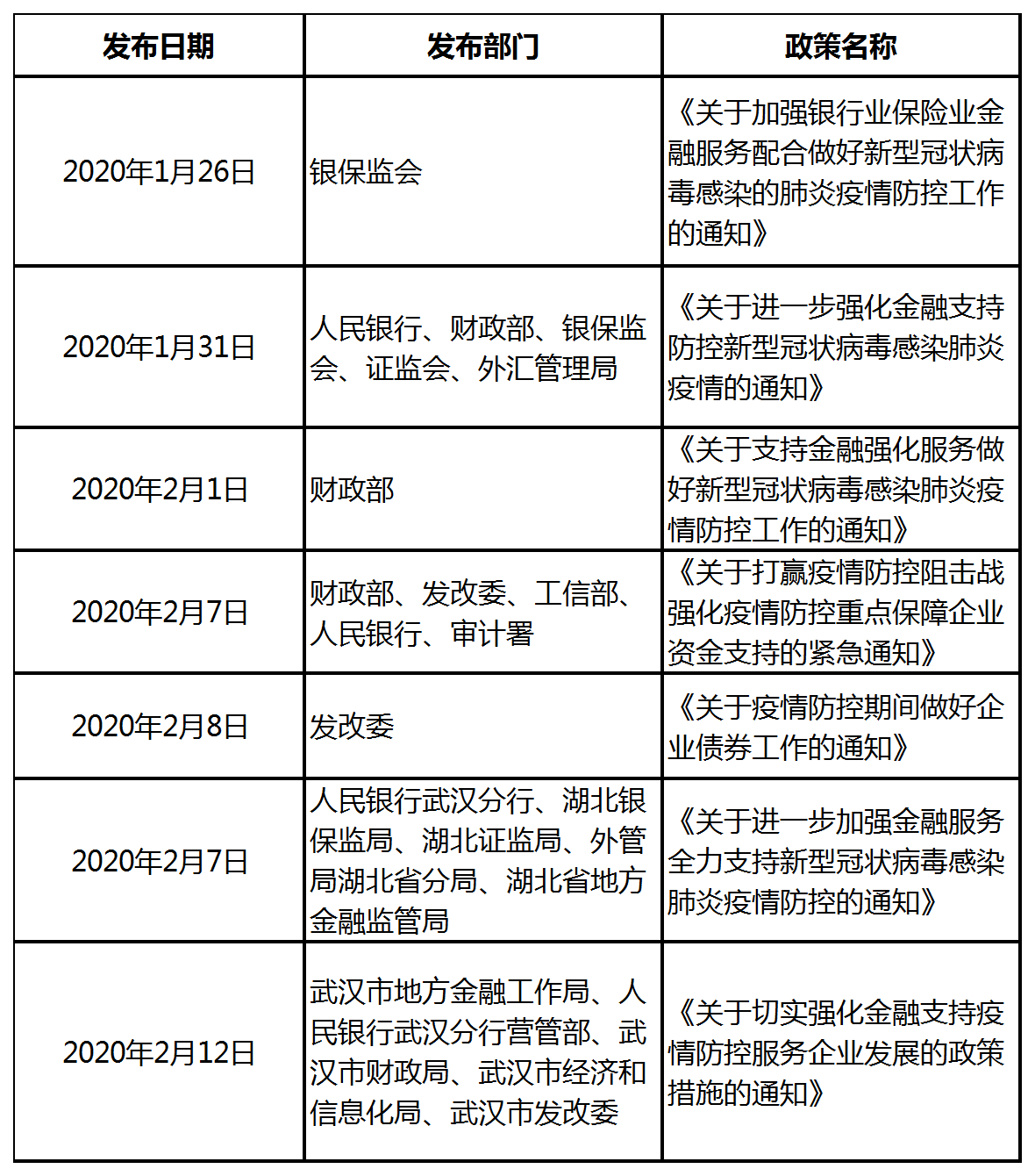 自防控新冠肺炎疫情战役打响以来,国家相关部委及时发布政策措施。2020年1月26日,银保监会发布《关于加强银行业保险业金融服务配合做好新型冠状病毒感染的肺炎疫情防控工作的通知》,随后,人民银行及国家相关部委相继出台助力企业渡过难关的金融支持政策措施。
