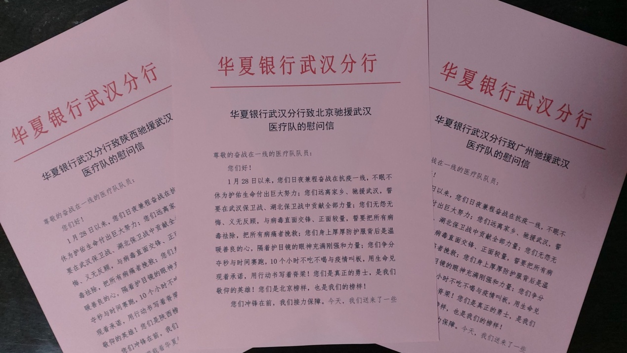 2月26日,分行党委书记带领工会主席和相关人员将捐款采购的生活物资送往北京、陕西、广州援汉医疗队驻点。为3支医疗队分别送上《华夏银行武汉分行致驰援武汉医疗队的慰问信》,向队员们远离家乡、驰援武汉、护佑生命的崇高精神表达感谢和敬意。