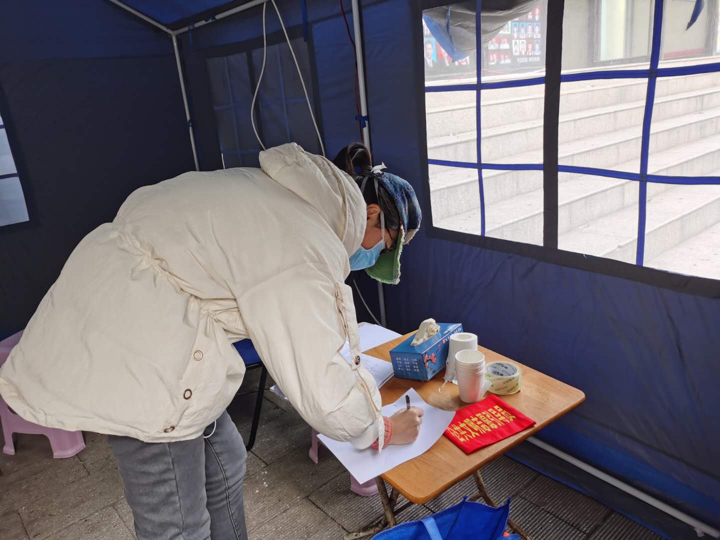 图二:周丹正在对邮局宿舍居民提出的物资需求逐一收集整理,制定采购清单