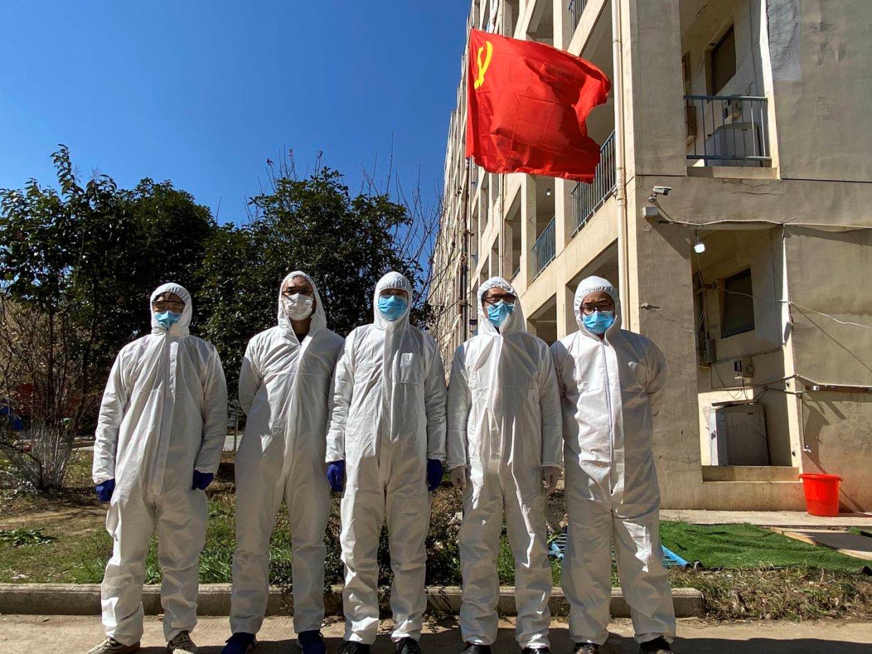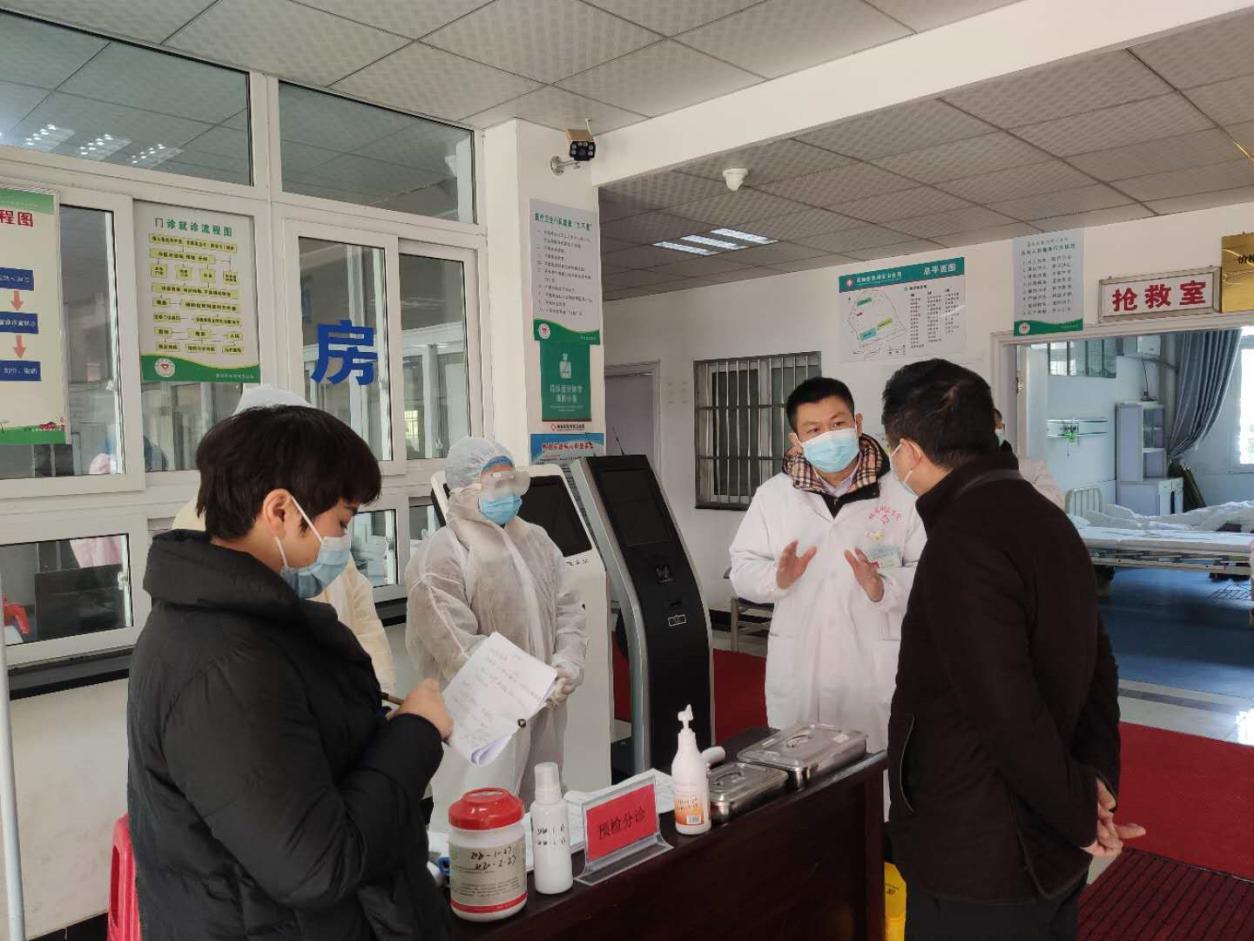 宋育红的丈夫(右一)正在蔡甸区张湾医院督察防疫工作