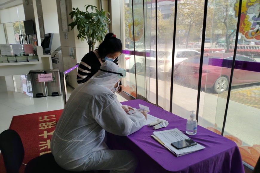 各二级分行为员工配备了包括口罩、护目镜、防护服、免洗洗手液、一次性手套、消毒液等在内的各种防护物资。同时,严格执行每日疫情报送制度和每日平安制度,建立员工个人健康台账,要求全体员工每日监测并报送,确保全行干部员工生命安全和身体健康。黄石分行严格落实复工防控“三到位”要求,制定员工岗位须知。为实现“零发病”管控目标,要求全行员工每天进行本人及家人的体温检测及“湖北健康码”绿码登记。为使员工展现良好的工作状态和精神面貌,聘请理发师到行为员工理发。宜昌分行提前联系酒店,每日为员工配送干净、营养的快餐,员工轮流到内部办公区域独自用餐,餐后垃圾由保洁人员集中清理消毒。