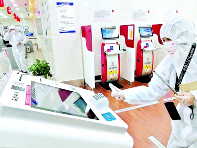 银行员工对网点各项设备进行消毒,积极筹备网点营业