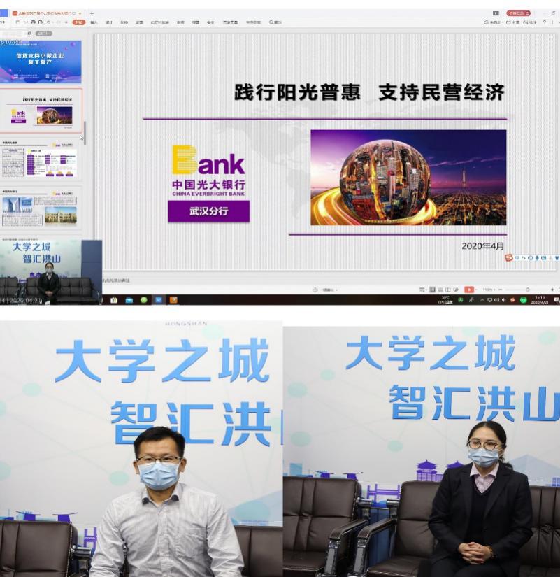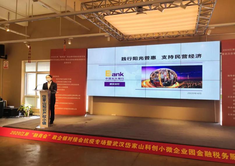 4月28日,光大银行武汉分行参加了在武汉岱家山科创小微企业园举办的2020江岸“融商会”政企银对接会,对武汉分行近期普惠信贷支持工作进行了汇报,并重点介绍了“阳光e抵贷”、“科保贷”等光大名品。