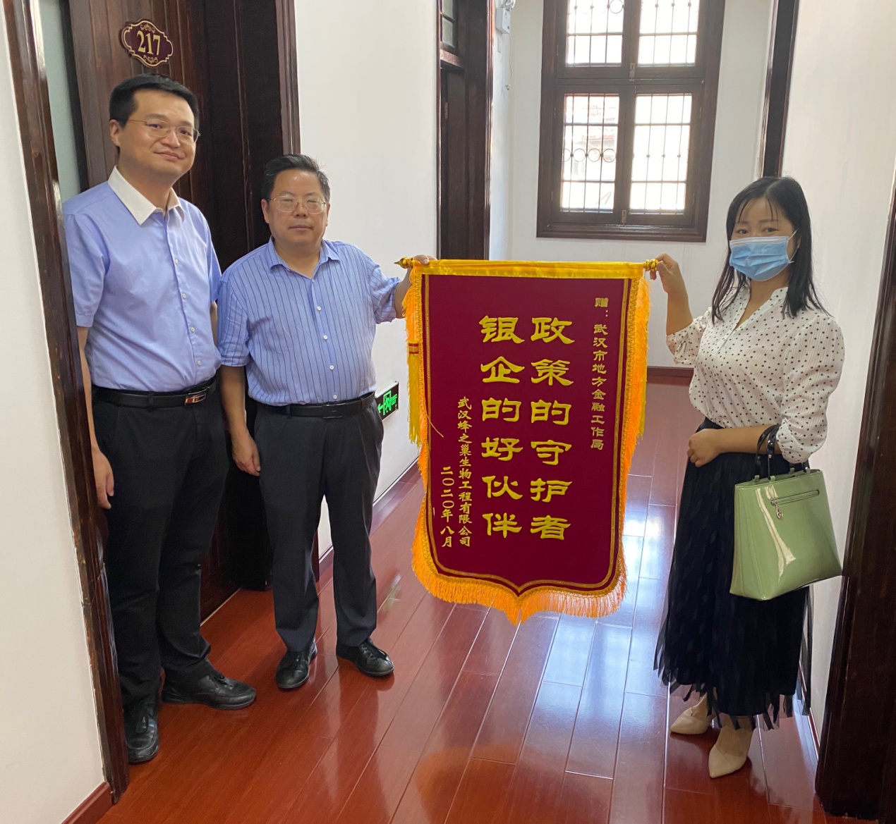 8月20日一大早,武汉蜂之巢生物工程有限公司负责人特地从公司所在地江夏赶到位于汉口的市地方金融工作局,表达真诚谢意,送上一面锦旗,为我局作为“政策的守护者,银企的好伙伴”而点赞。