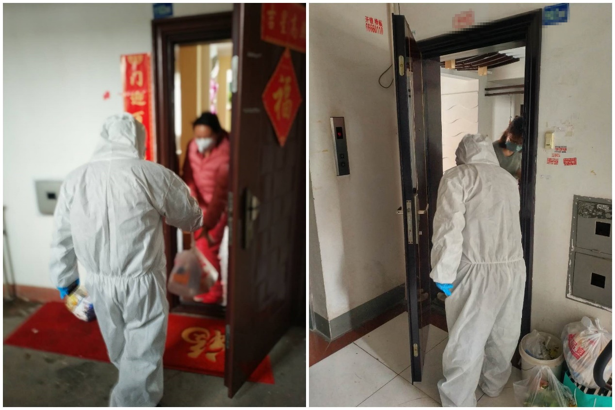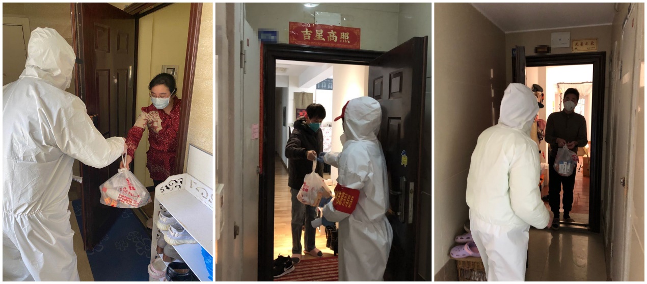 第三小组殷盛、吕晨(右)同志为徐东路东中村居民派发物资,吕晨系民革党员,居家解除隔离后立即主动投入到下沉社区工作中