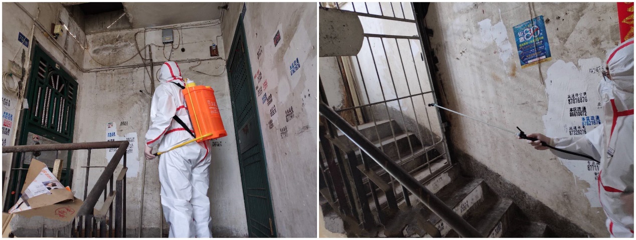 第二小组姜俊、汪军同志为黄鹂路社区邮局宿舍作楼道消毒