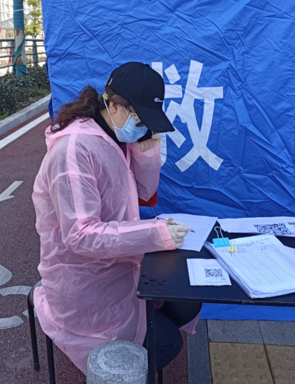 第一小组阎鸿、徐海兰、程文辉、李由同志在滨湖社区中北春天小区作上门排查。因为社区规模大,情况复杂,摸清底数困难重重。忙完天已黑,初春的寒冷也挡不住防护服里的闷热,汗水湿透了贴身的衣服。今天是三天拉网大排查的最后一天,交卷在即,第三小组殷盛、李媛媛两位同志完成各自下沉社区的排查工作,就马不停蹄赶了过来,加入第一小组,第二小组黄寅皓同志也通过电话帮助排查,对比前期数据,查漏补缺。经过大家齐心协力,各组共完成了近1600户居民的排查工作。对于排查出的疑似及密切接触人员风险问题,立即上报社区干部和网格员,同社区数据核对,并提出建议、协助做好联系病人、安排转运等事宜,确保“不漏一户、不漏一人”,切实防控风险隐患。