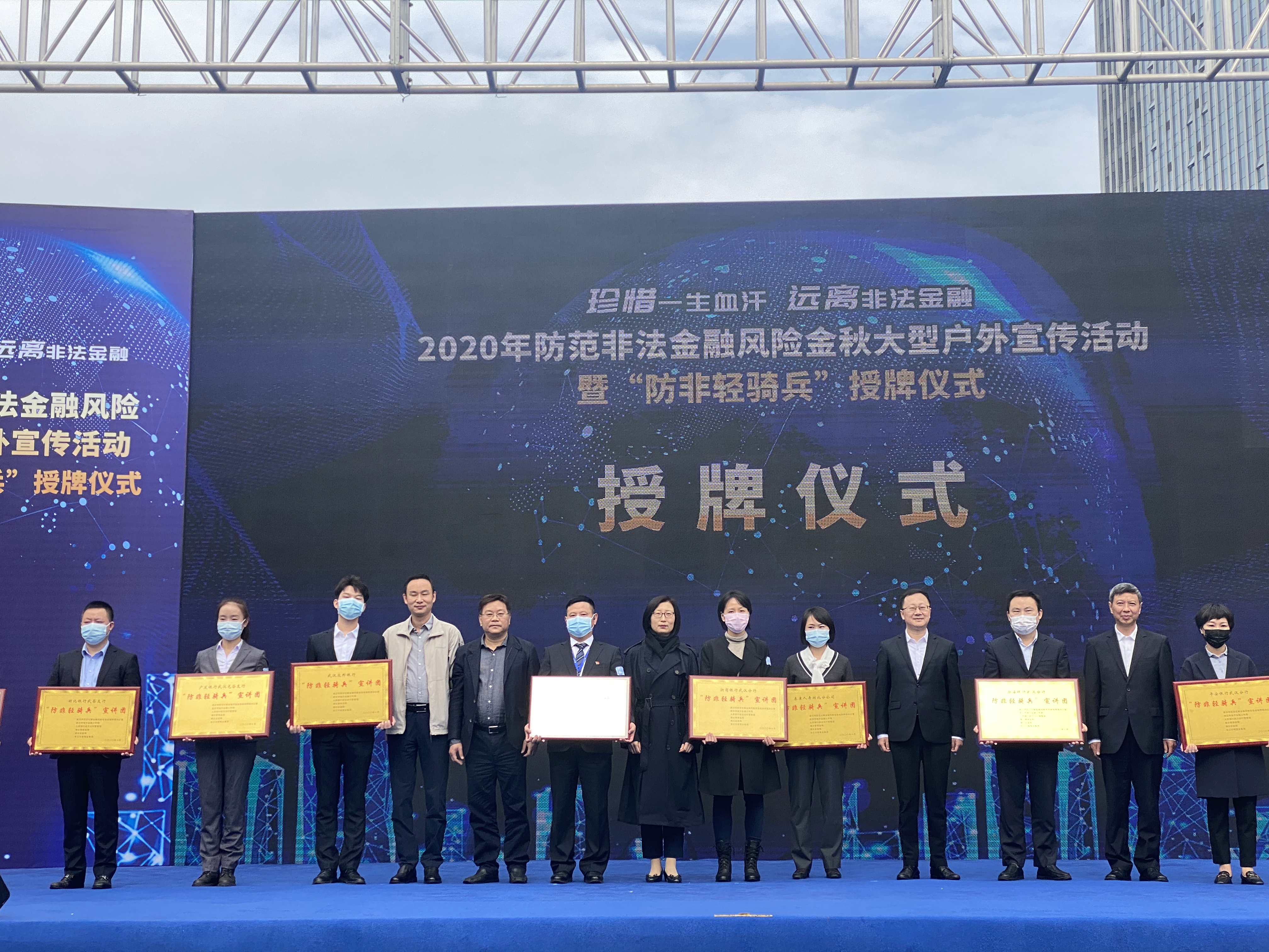 为进一步贯彻市委、市政府决策部署,坚决履行好防范化解重大风险政治任务,提升群众识别和防范非法金融活动能力,动员更多金融机构、社会团体、市民共同打好防范化解金融风险攻坚战,市防范化解金融风险攻坚战指挥部办公室于10月21日在武昌区积玉桥街武汉工人文化宫户外广场组织开展2020防范金融风险金秋大型户外宣传暨“防非轻骑兵”授牌活动。市人民政府副秘书长、市防范化解金融风险攻坚战指挥部办公室主任方洁,长江日报报业集团党委书记、董事长(社长)、总编辑陈光,市地方金融工作局、人行武汉分行营管部、武昌区政府分管领导,市公安局、检察院、法院、市场监管局等指挥部主要成员单位相关负责同志、积玉桥街道主要负责人,以及26家在汉主要银行、保险、证券金融机构代表出席。