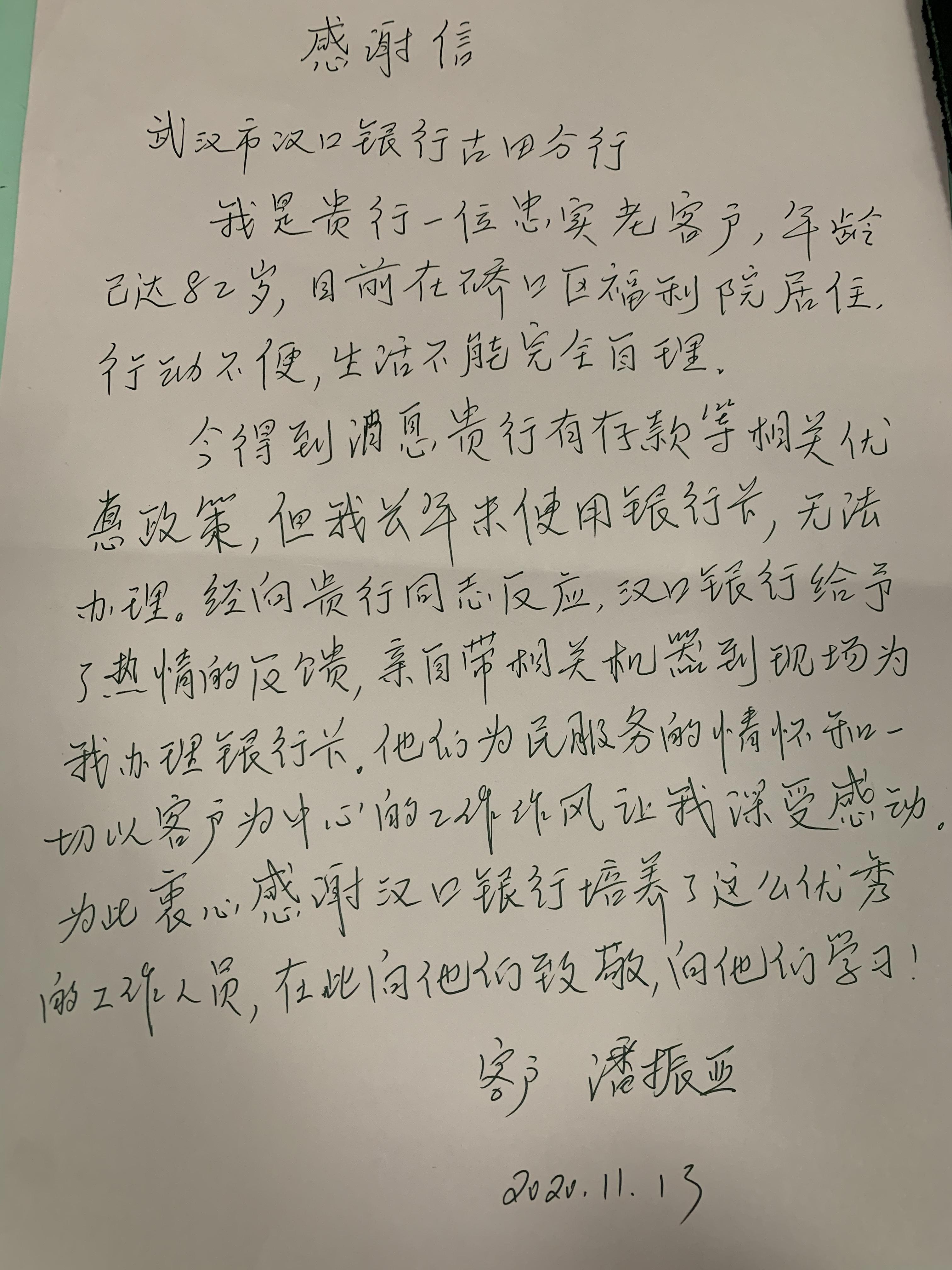 图为汉口银行硚口支行收到老年客户手写感谢信