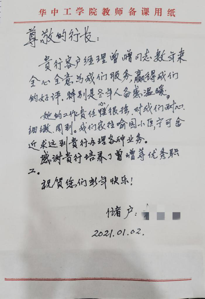 2021年1月3日早上,中国工商银行武汉喻家山支行如往常一样开门迎客,客户井然有序取号等候。正值元旦期间,每位客户脸上都洋溢着新年的喜悦。这时,一位老人颤颤巍巍走进网点,将一封手写的表扬信交到网点负责人手中,表扬网点员工曾嶒,对她的真情服务表示满意和肯定。