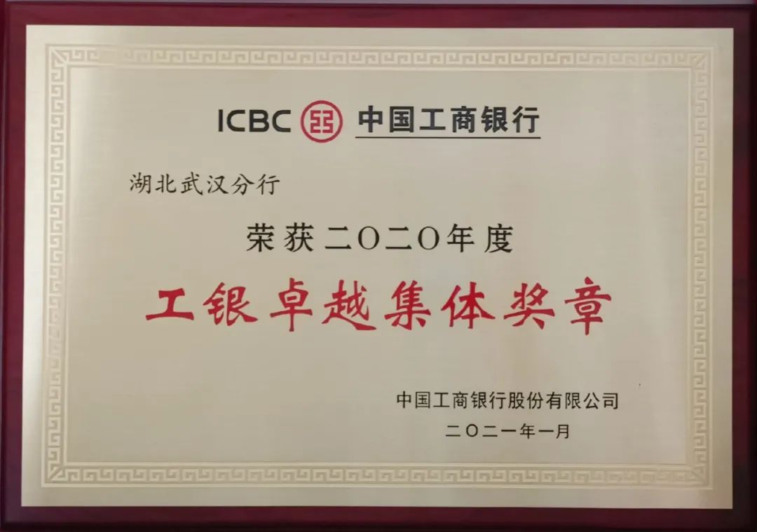 2021年1月15日,在中国工商银行首届“工银卓越奖章”颁奖典礼上,中国工商银行武汉分行被授予“工银卓越集体奖章”。“工银卓越奖章”是中国工商银行最高综合类荣誉表彰,全球工行共有10家机构荣获首届“工银卓越集体奖章”。