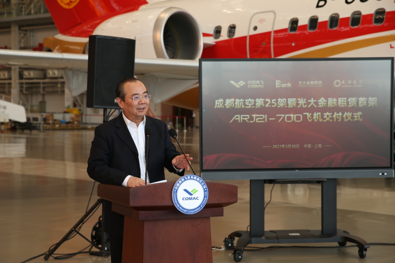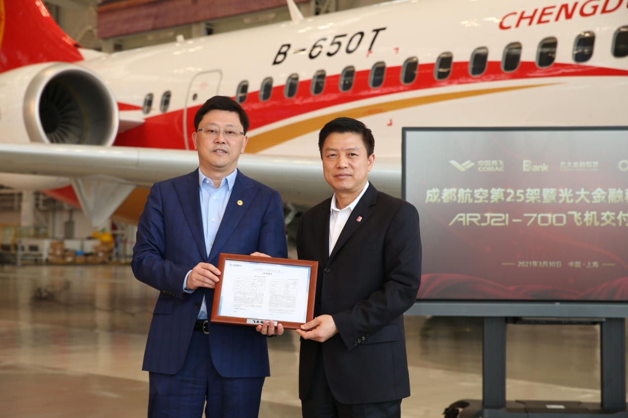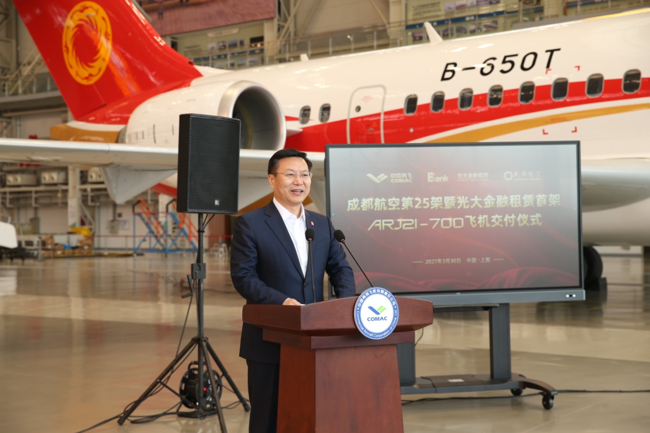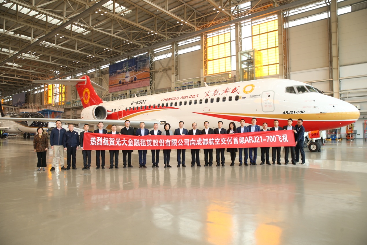 2021年3月30日,光大金融租赁股份有限公司(下称“光大金租”)在上海向成都航空有限公司(下称“成都航空”)成功交付双方合作的第一架ARJ21飞机,这也是光大金租从中国商用飞机有限责任公司(下称“中国商飞”)采购并接收的首架ARJ21飞机。中国光大银行(下称“光大银行”)副行长曲亮,中国商飞副总经理、总会计师吴永良,成都航空副总经理周勇出席交付仪式并致辞。
