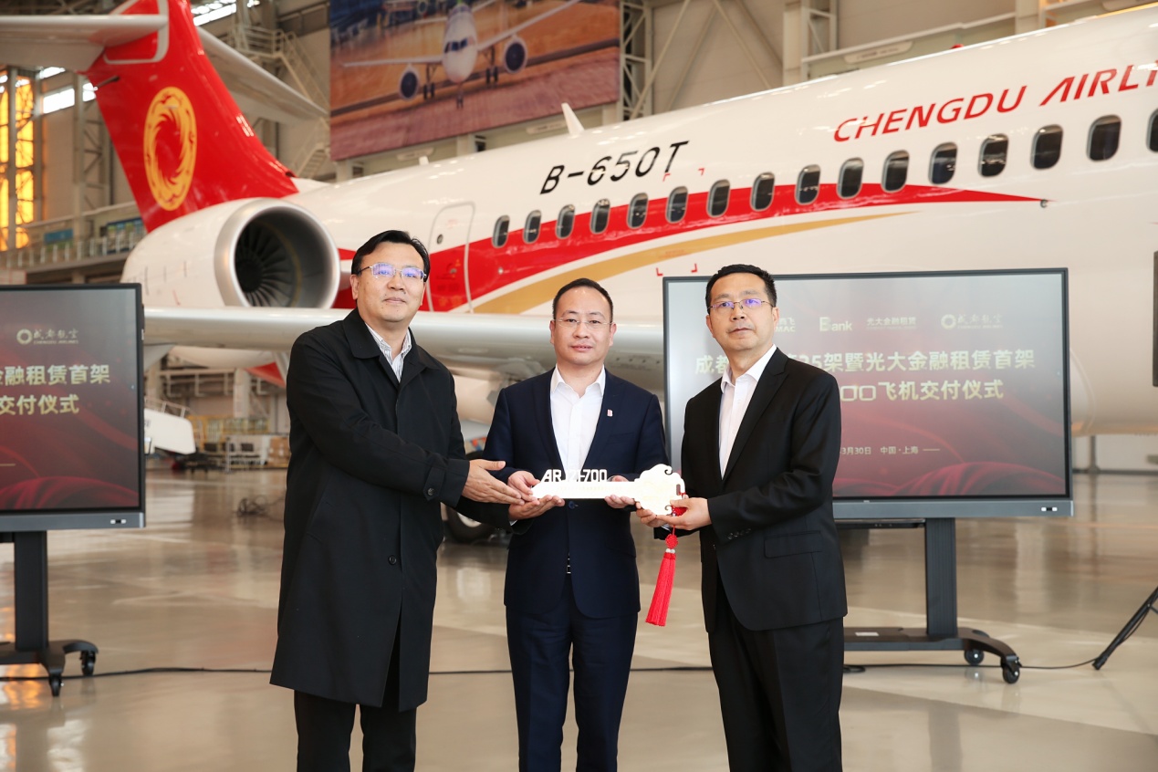 中国商飞生产部副部长张晓晰、光大金租总裁魏超以及成都航空副总经理周勇共同完成了此架飞机交付纪念钥匙的移交。