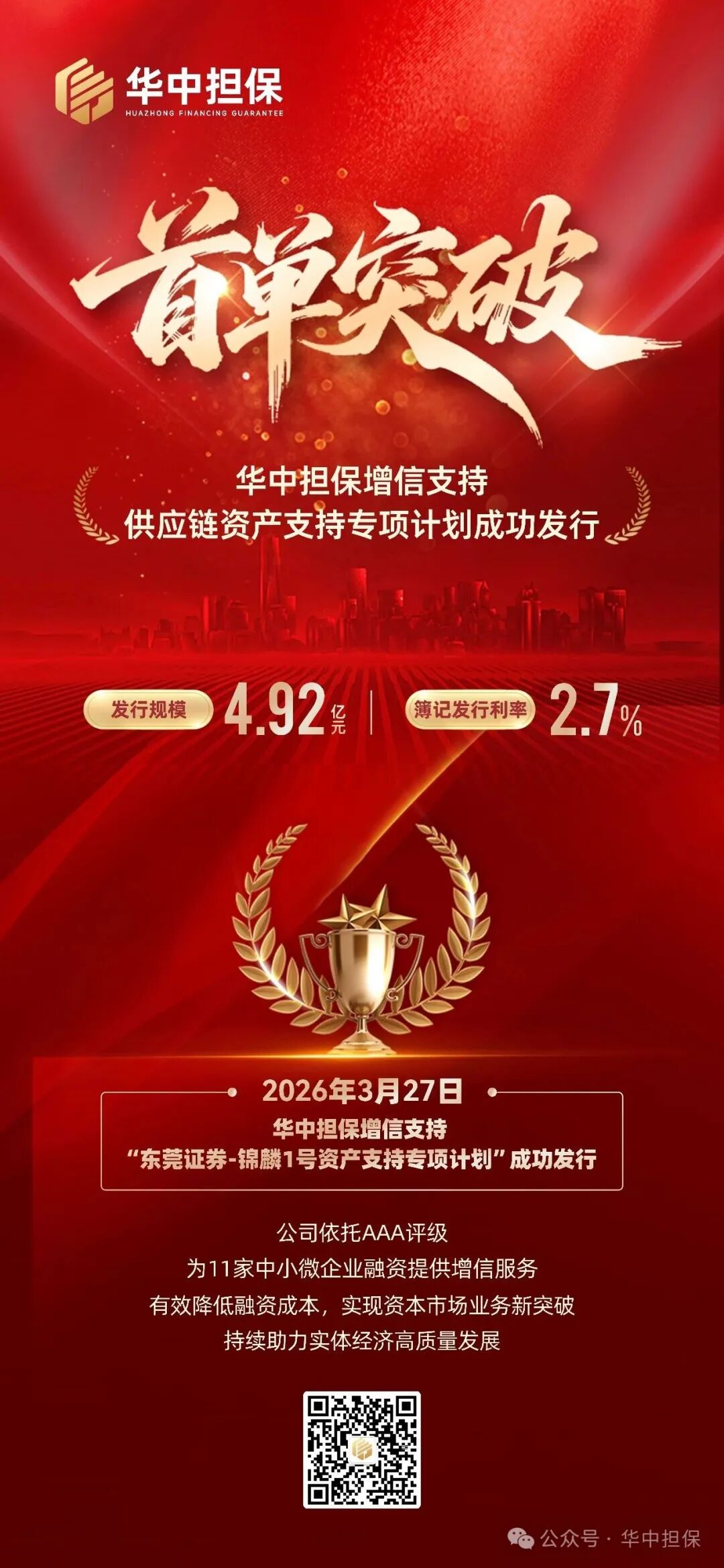 2026年3月27日,“东莞证券﹣锦麟1号资产支持专项计划”成功发行,发行规模4.92亿元,簿记建档优先A级利率2.7%。该项目由华中担保提供担保,是华中担保首次为供应链ABS产品提供增信支持。