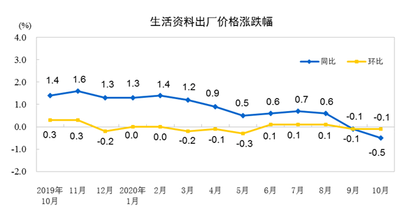 2020年10月份,全国工业生产者出厂价格同比下降2.1%,环比持平;工业生产者购进价格同比下降2.4%,环比上涨0.2%。1―10月平均,工业生产者出厂价格比去年同期下降2.0%,工业生产者购进价格下降2.6%。