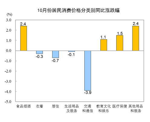 10月份,全国居民消费价格环比下降0.3%。其中,城市下降0.3%,农村下降0.5%;食品价格下降1.8%,非食品价格上涨0.1%;消费品价格下降0.6%,服务价格上涨0.1%。