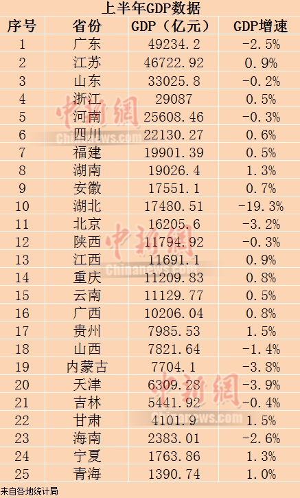 广东上半年GDP为49234.20亿元,同比下降2.5%;江苏上半年GDP为46722.92亿元,同比增长0.9%;山东上半年GDP为33025.8亿元,同比下降0.2%。
