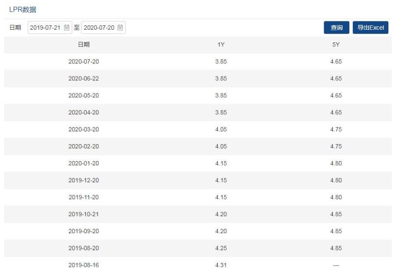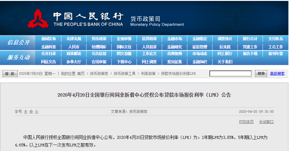 7月20日早间,中国人民银行授权全国银行间同业拆借中心公布,2020年7月20日贷款市场报价利率(LPR)为:1年期LPR为3.85%,5年期以上LPR为4.65%,与上个月持平。