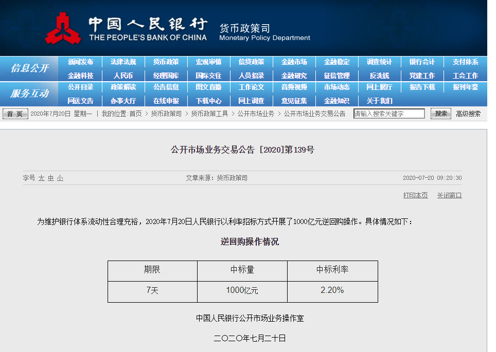 7月20日同天,央行公开市场开展1000亿元7天期逆回购操作,今日500亿元逆回购到期,单日净投放500亿元。