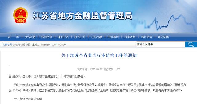 近日,江苏省地方金融监督管理局发布《关于加强全省典当行业监管工作的通知》,全文如下: