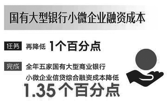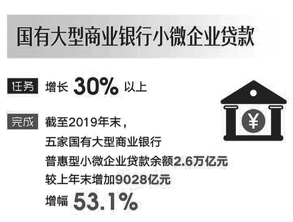 国务院近日对外公布2019年《政府工作报告》量化指标任务落实情况表,这份“成绩单”显示,38项指标任务均已完成。其中,2019年5家国有大型商业银行普惠型小微企业贷款余额增长53.1%,小微企业信贷综合融资成本降低1.35个百分点,均超额完成任务(详见图表)。