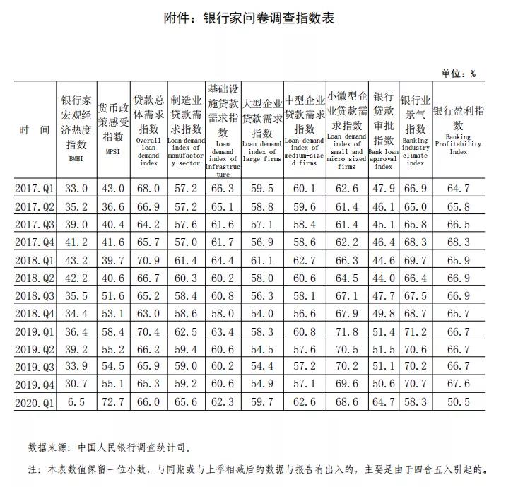 2020年第一季度中国人民银行开展的全国银行家问卷调查结果显示: