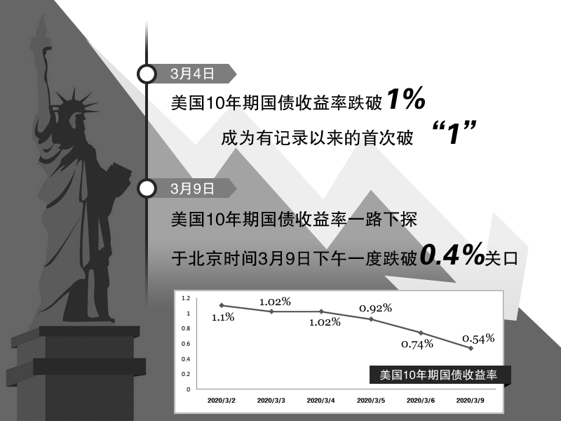 从美债市场看,十年期国债等代表性品种的收益率迭创新低。3月4日,美国10年期国债收益率跌破1%,成为有记录以来的首次破“1”。此后,这一收益率继续不断下探新低。3月9日,美国10年期国债收益率一路下探,于北京时间3月9日下午一度跌破0.4%关口,再次让投资者大跌眼镜。当天,30年期美国国债在有史以来首次跌破1%后,继续下行,一度下探至0.702%,续刷历史新低。