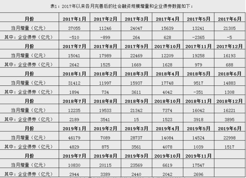 注2:2019年9月起,人民银行进一步完善“社会融资规模”中的“企业债券”统计,将“交易所企业资产支持证券”纳入“企业债券”指标,2017年以来可比口径数据见表1。