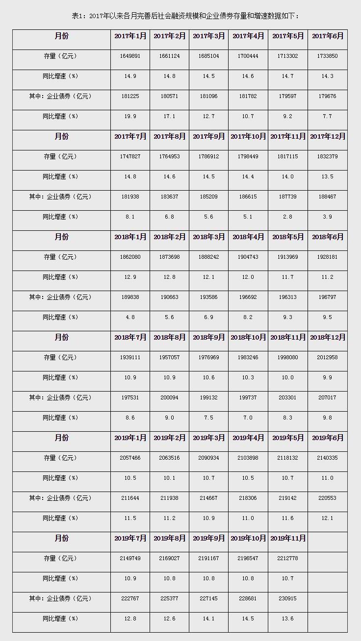 注2:2019年9月起,人民银行进一步完善“社会融资规模”中的“企业债券”统计,将“交易所企业资产支持证券”纳入“企业债券”指标,2017年以来可比口径数据见表1。