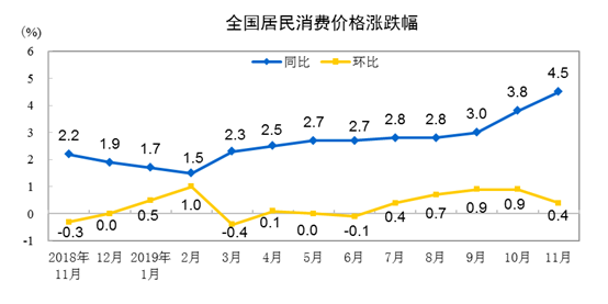 2019年11月份,全国居民消费价格同比上涨4.5%。其中,城市上涨4.2%,农村上涨5.5%;食品价格上涨19.1%,非食品价格上涨1.0%;消费品价格上涨6.5%,服务价格上涨1.2%。1—11月平均,全国居民消费价格比去年同期上涨2.8%。