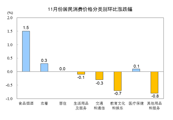 11月份,全国居民消费价格环比上涨0.4%。其中,城市上涨0.3%,农村上涨0.5%;食品价格上涨1.8%,非食品价格持平;消费品价格上涨0.8%,服务价格下降0.4%。