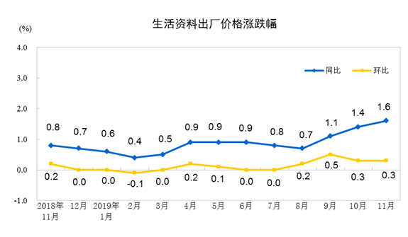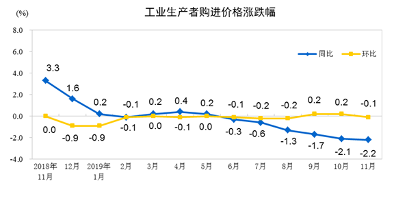 2019年11月份,全国工业生产者出厂价格同比下降1.4%,环比下降0.1%;工业生产者购进价格同比下降2.2%,环比下降0.1%。1—11月平均,工业生产者出厂价格比去年同期下降0.3%,工业生产者购进价格下降0.7%。