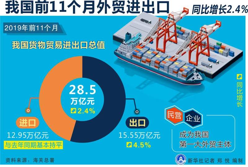 据海关统计,今年前11个月,我国货物贸易进出口总值28.5万亿元人民币,比去年同期(下同)增长2.4%。其中,出口15.55万亿元,增长4.5%;进口12.95万亿元,与去年同期基本持平;贸易顺差2.6万亿元,扩大34.9%。