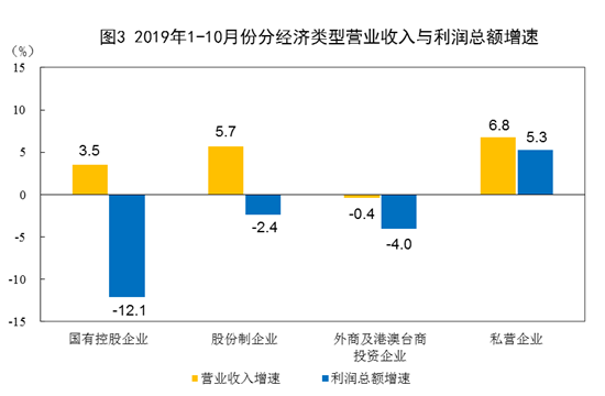1—10月份,规模以上工业企业中,国有控股企业实现利润总额14715.5亿元,同比下降12.1%;股份制企业实现利润总额36623.3亿元,下降2.4%;外商及港澳台商投资企业实现利润总额12585.0亿元,下降4.0%;私营企业实现利润总额13915.0亿元,增长5.3%。