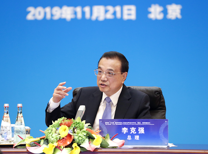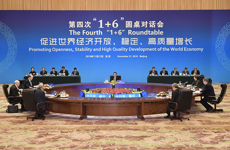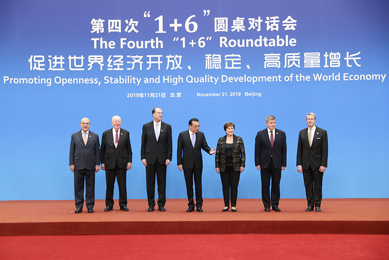 国务院总理李克强11月21日上午在钓鱼台国宾馆同世界银行行长马尔帕斯、国际货币基金组织总裁格奥尔基耶娃、世界贸易组织副总干事沃尔夫、国际劳工组织总干事莱德、经济合作与发展组织秘书长古里亚和金融稳定理事会主席夸尔斯举行第四次“1+6”圆桌对话会。会议围绕“促进世界经济开放、稳定、高质量增长”的主题,就世界经济前景与应对措施、推进全球治理改革等议题深入交流。