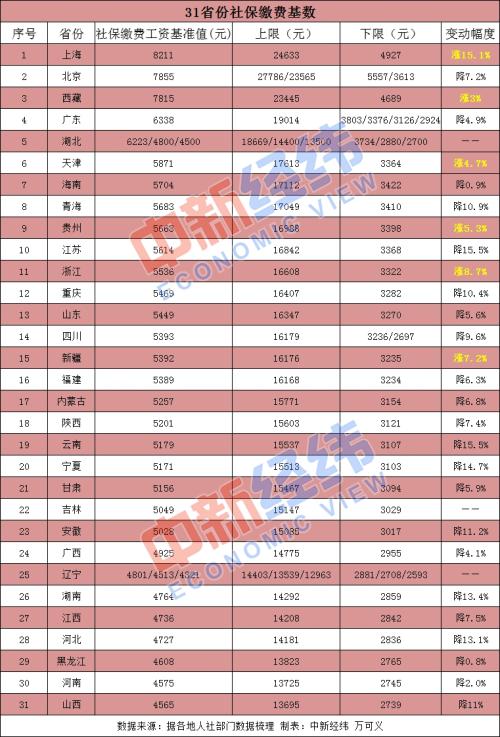 从变化情况来看,大多数地区不同幅度降低了缴费基数。江苏、云南两省社保缴费基数降幅居前两位,均为下降15.5%;此外,青海、重庆、宁夏、湖南等7省份降幅也都超过10%。